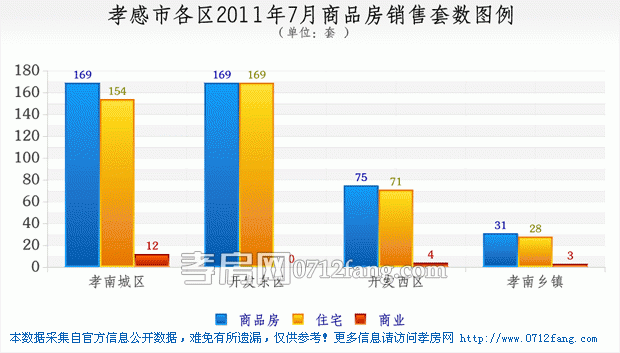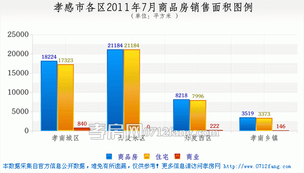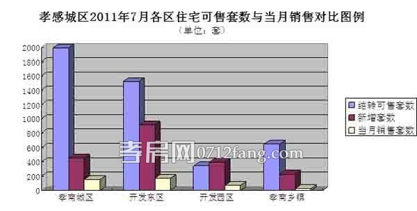 据孝房网研究的统计数据显示,2011年7月 (7月1日——7月31日),孝感市城区(注:本篇城区为孝南城区、开发东区、开发西区、孝南乡镇统称)商品房共成交444套,环比销量下降28.5%;其中商品房住宅成交422套,成交金额175303282.38元,销售面积49876.92平米,均价3514.72元/平方米,环比上涨7.8%,平均成交面积118.2平米;商铺成交19套;车库成交2套;其它成交1套。截至到7月31号全市住宅可售房源6490套,其中孝南城区可售2441套,开发东区可售2437套,开发西区可售740套,孝南乡镇可售872套。