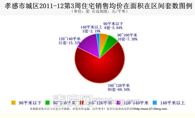 2011年12月3周(12月12日-12月18日)据孝房网研究的统计数据显示,孝感城区商品房共销售147套,销售面积38665.13平米,销售总金额142864820.22元,销售均价3694.93元/平米。其中住宅销售为137套,销售面积15258.72平米,销售均价2765.82元/平米。非住宅销售为10套,销售均价4300.62元/平米。