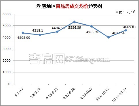 从10月13日到10月19日,孝感区域商品房成交均价为4609.81元/㎡。从九月下旬开始,商品房成交均价持续下降,上周略有回升,达到了4909.81元/㎡。对比九月下旬高一周的5336.39元/㎡,下降了13.6%;对比前面一周的4017.56元/㎡,上涨了了14.7%。上周商品房成交均价涨幅不大。