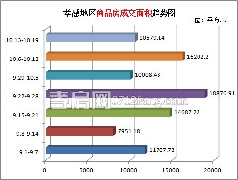 从10月13日到10月19日,孝感区域商品房成交面积为10579.14平方米。自9月起商品房成交面积变化起伏较大,近六周总体来看还是呈下降趋势。对高一周的18876.91平方米,上周商品房成交面积下降了43.96%。对比上周的16202.2㎡,下降了34.7%,对比低一周7951.18㎡,下降了33.05%。上周商品房成交面积有所下降。当然,成交面积下降也受数据统计不全的影响。